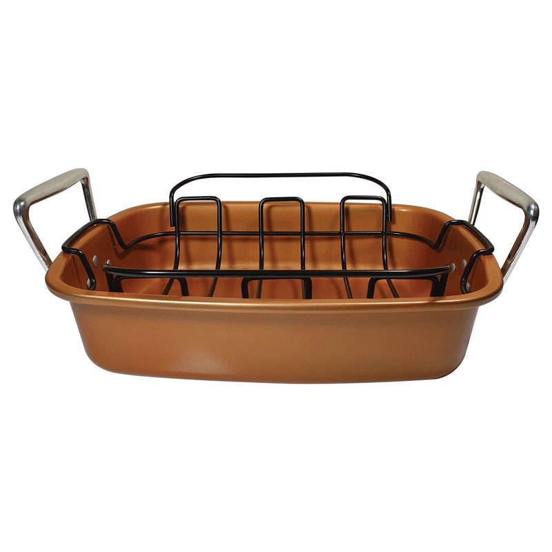 COPPER ROASTER je veliki pekač sa rešetkom – savršen da u njemu pripremate sva jela od mesa, pogotovo but, rebra ili plećku, celo pile, ćurku, krompir, grilovano povrće, sarmu, podvarak i sve drugo što Vam može pasti na pamet.