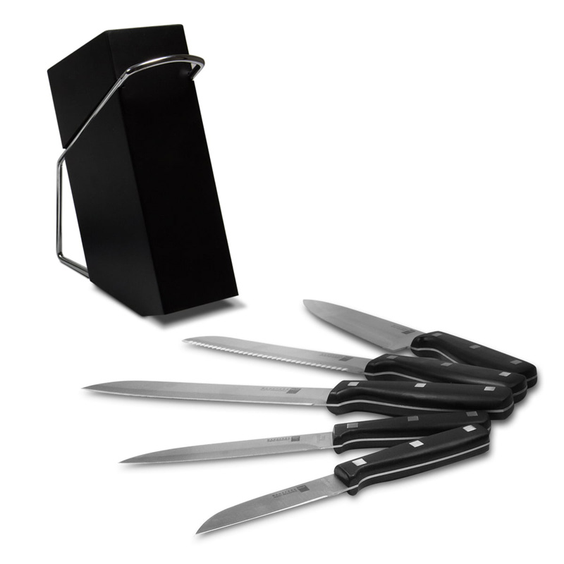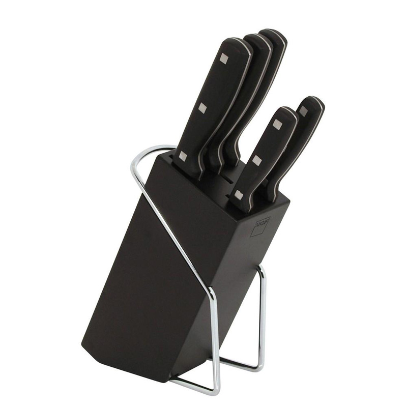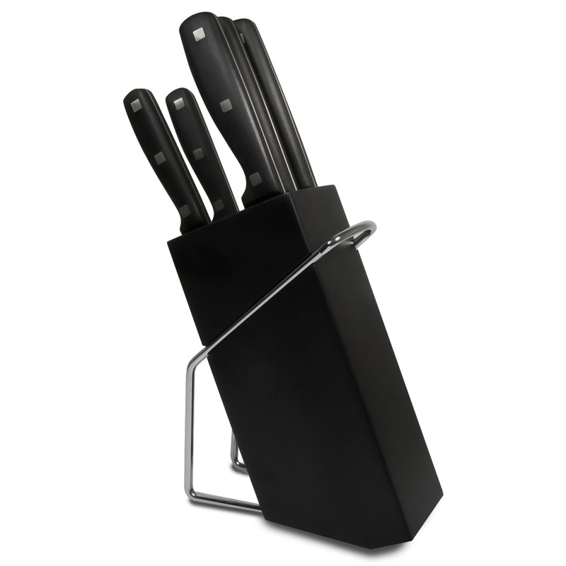 Uz set dolazi i moderan elegantan stalak crne boje sa elementima od INOX-a. Izrađen je iz jednog bloka punog drveta fine završne obrade i nalazi se pod nagibom za lakše vađenje i odlaganje noževa. Sečiva se u potpunosti nalaze unutar bloka čime se povećava opšta sigurnost u kuhinji i smanjuje mogućnost nezgode, čak i kada se noževi ne koriste.