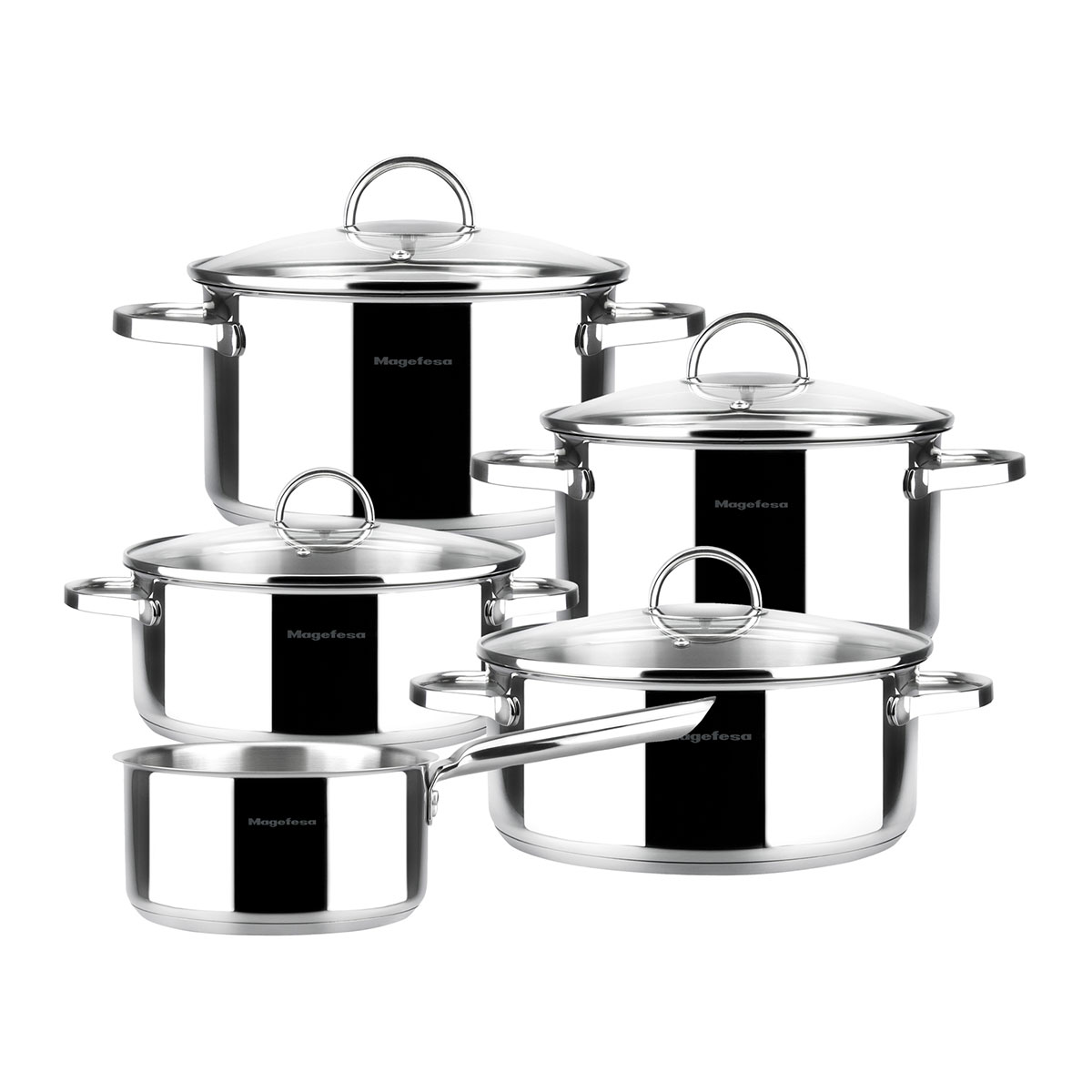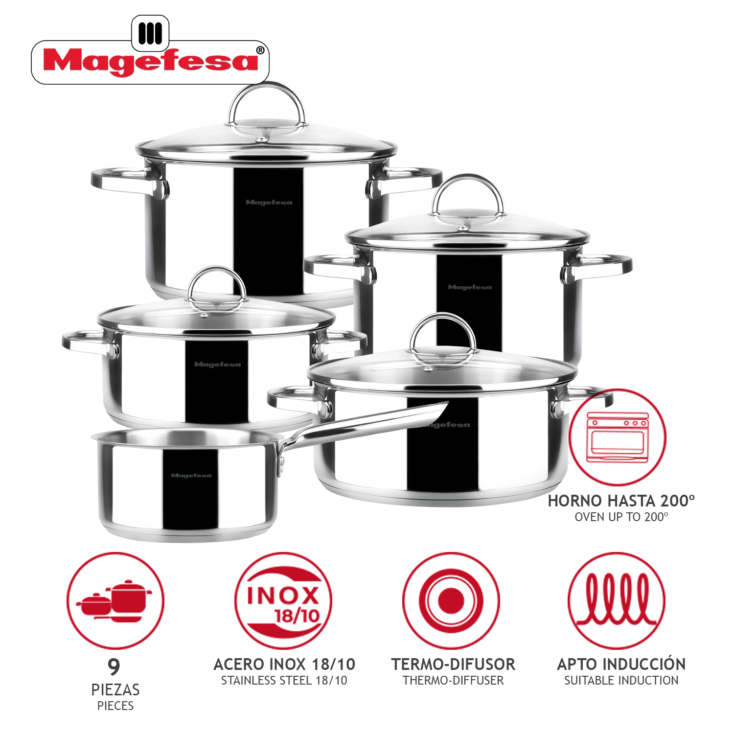 Set posuđa od INOX-a 9/1 – Madrid je deo Magefesine MAG linije proizvoda od 9 elemenata: četiri posude sa ručkama i staklenim poklopcem i posude sa drškom. Može se koristiti na svim izvorima toplote, uključujući indukcione ploče, dok termički difuzor u dnu posuda ravnomerno raspoređuje toplotu i štedi i do 75% energije potrebne za kuvanje.