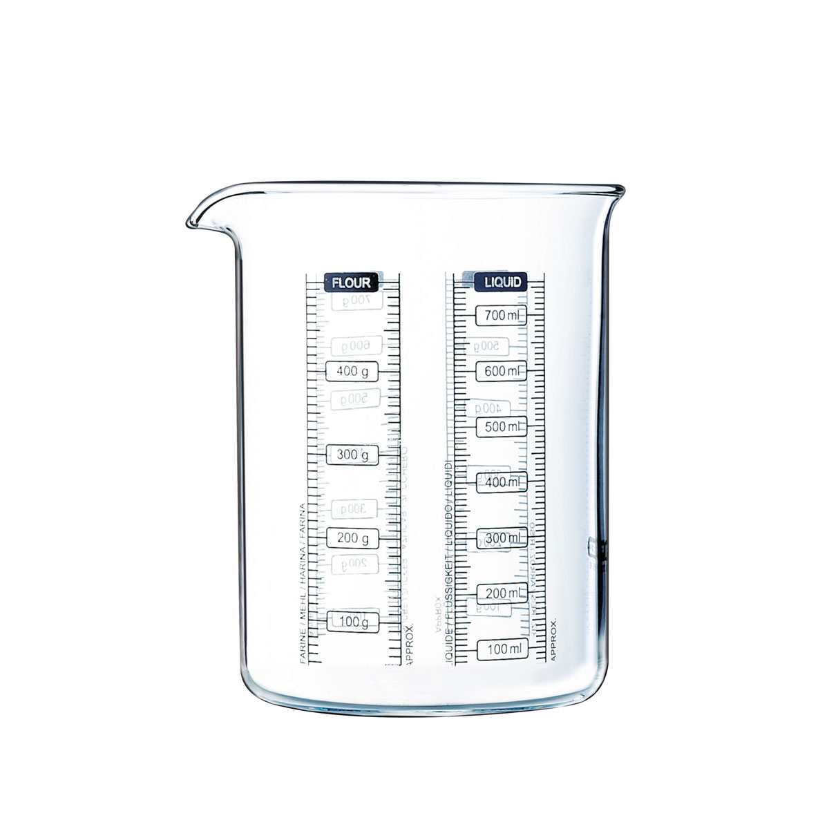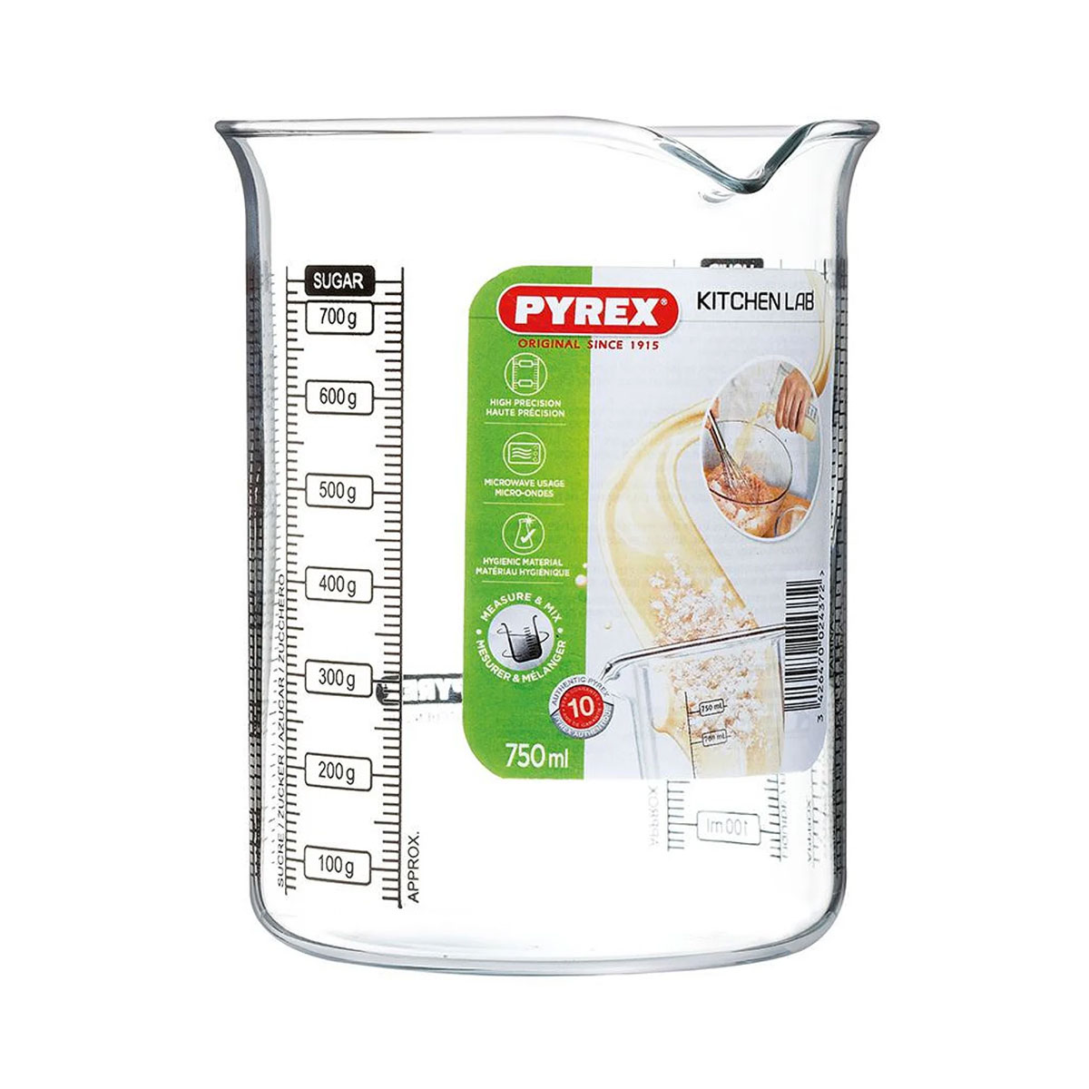 Pyrex višenamenska staklena posuda za merenje izrađena od vatrostalnog stakla. Sa merama za količinu najčešćih kuhinjskih namirnica – pirinač, brašno, šećer i tečnost. Otporna na ekstremno niske (-40°C) i visoke (300°C) temperature, kao i termalni šok. Može se koristiti u rerni, mikrotalasnoj i zamrzivaču. Laka za pranje i čišćenje, pogodna za pranje u mašini za pranje sudova.